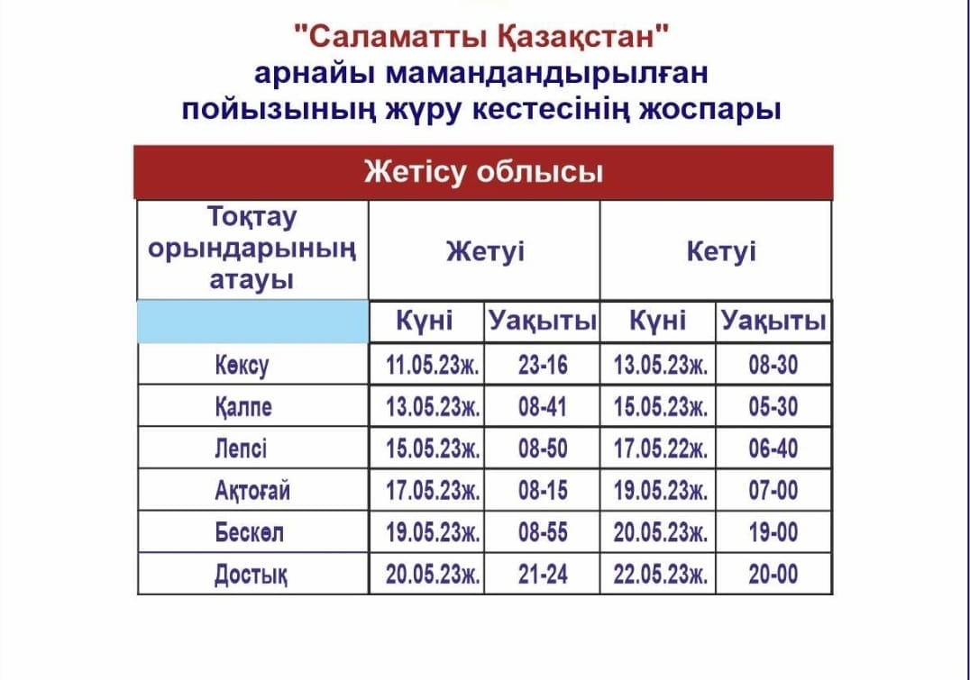 10-22 мамыр аралығында Жетісу облысының Көксу, Кальпе, Лепсі, Ақтоғай, Бескөл, Достық станцияларында «Саламатты Қазақстан » мамандандырылған медициналық пойызы шалғайдағы станциялар мен жақын орналасқан елді мекендердің тұрғындарын тегін медициналық тексеруден өткізеді.