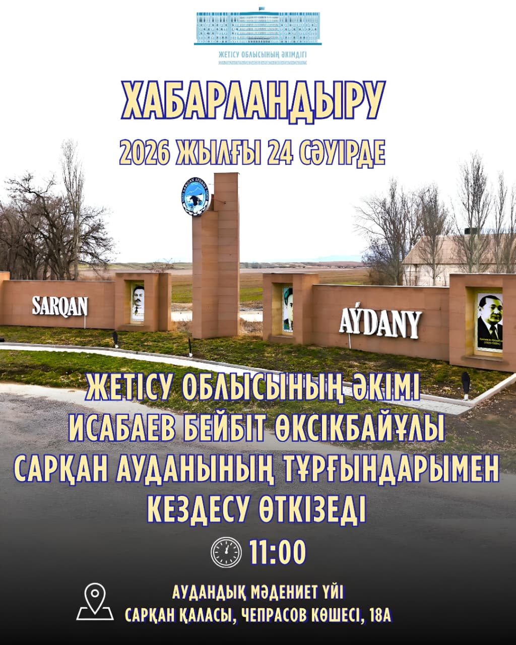 Жетісу облысының әкімі Бейбіт Өксікбайұлы Исабаев 2026 жылғы 24 сәуір сағат 10.00-де аудандық мәдениет үйінің ғимаратында (Сарқан қ., Чепрасов к., 18 А) аудан тұрғындарын жеке мәселелері бойынша қабылдайды.