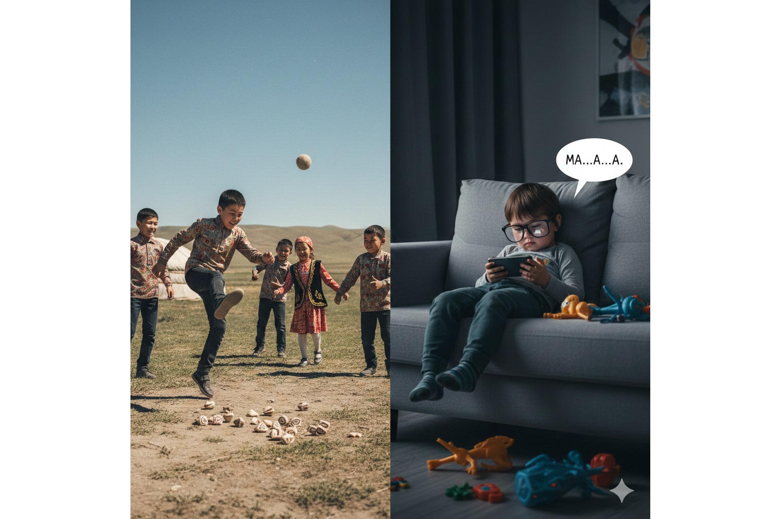 Кешегіңе қарап, ертеңінді ойлайсың. Ал бүгінге бет бұрсаң, көп нәрсеке көңіл толмайды. Үлкендерден «біздің кезімізде…» деп басталатын әңгімені өзіміз де айтып жүрміз. ХХ ғасырдың тоқсаныншы жылы өмірге келген біздің балалық тоқырау кезеңге тұспа-тұс келді. Ауылда шаң мен топырақ жұтып, балшықтан үй жасап, омбы қарды кешіп өсіп едік. Ағаштан ат ертеп, жапырақтан ләңгі теуіп, «Көксерек», «Қуаласпақ», «Тышқан мен мысық», «Лапта» сынды ойынды ермек етіп, қала берді асық ату мен резеңкеден секіруді әдет қылдық. Қазіргілер ше?
