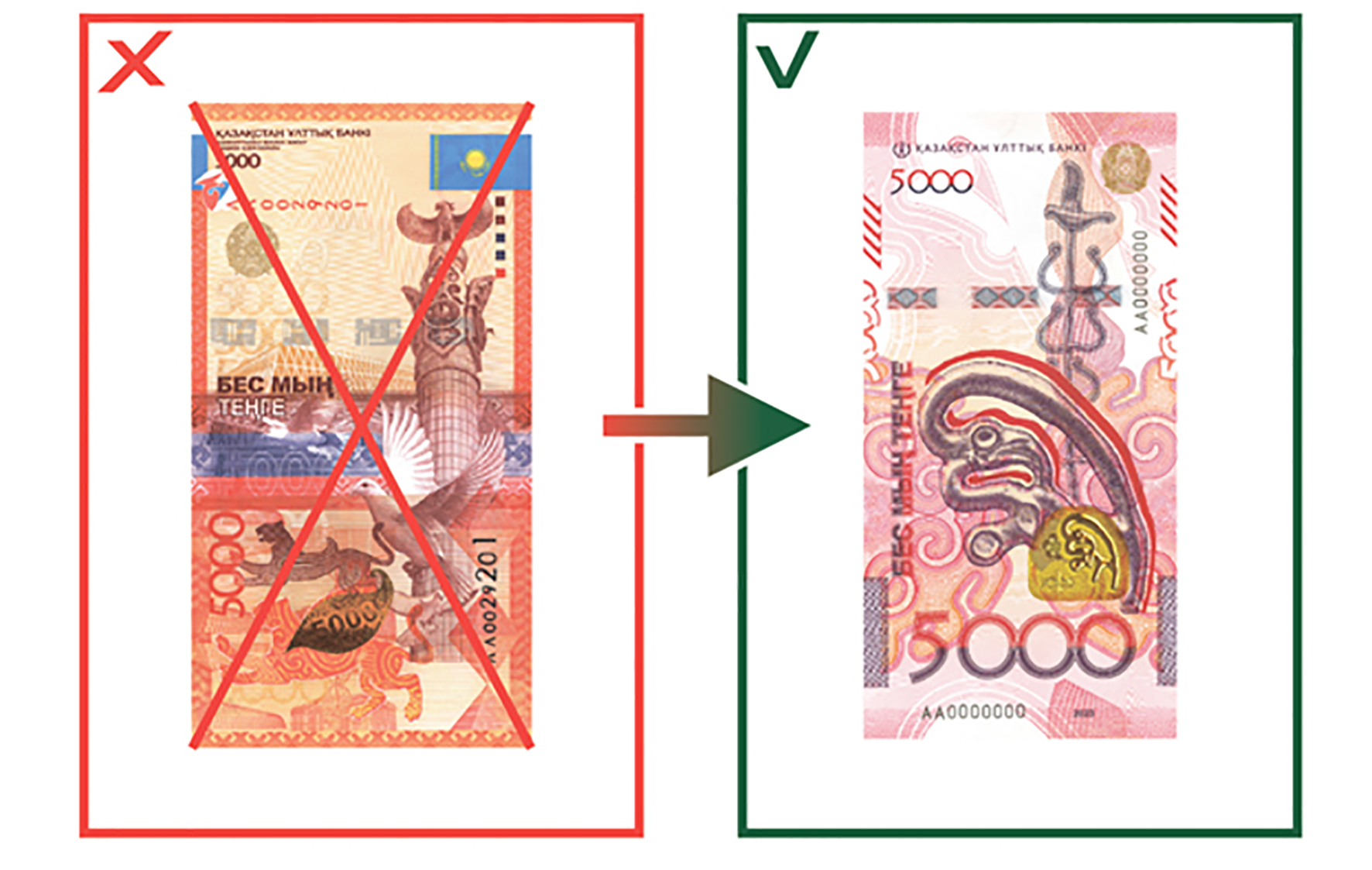• Барлық екінші деңгейлі банктер мен «Қазпошта» АҚ ескі үлгідегі 5000 теңгелікті үш жыл ішінде жаңа үлгідегі банкнотқа айырбастайды.