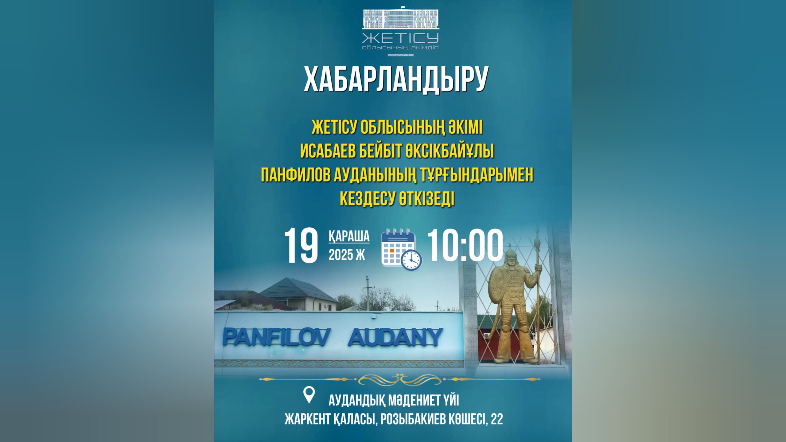 Жетісу облысының әкімі Бейбіт Өксікбайұлы Исабаев 2025 жылғы 19 қараша сағат 09.00-да Панфилов ауданының мәдениет үйі ғимаратының 1-қабатында (Жаркент қаласы, Розыбакиев көшесі, 22) аудан тұрғындарын жеке мәселелері бойынша қабылдайды.
