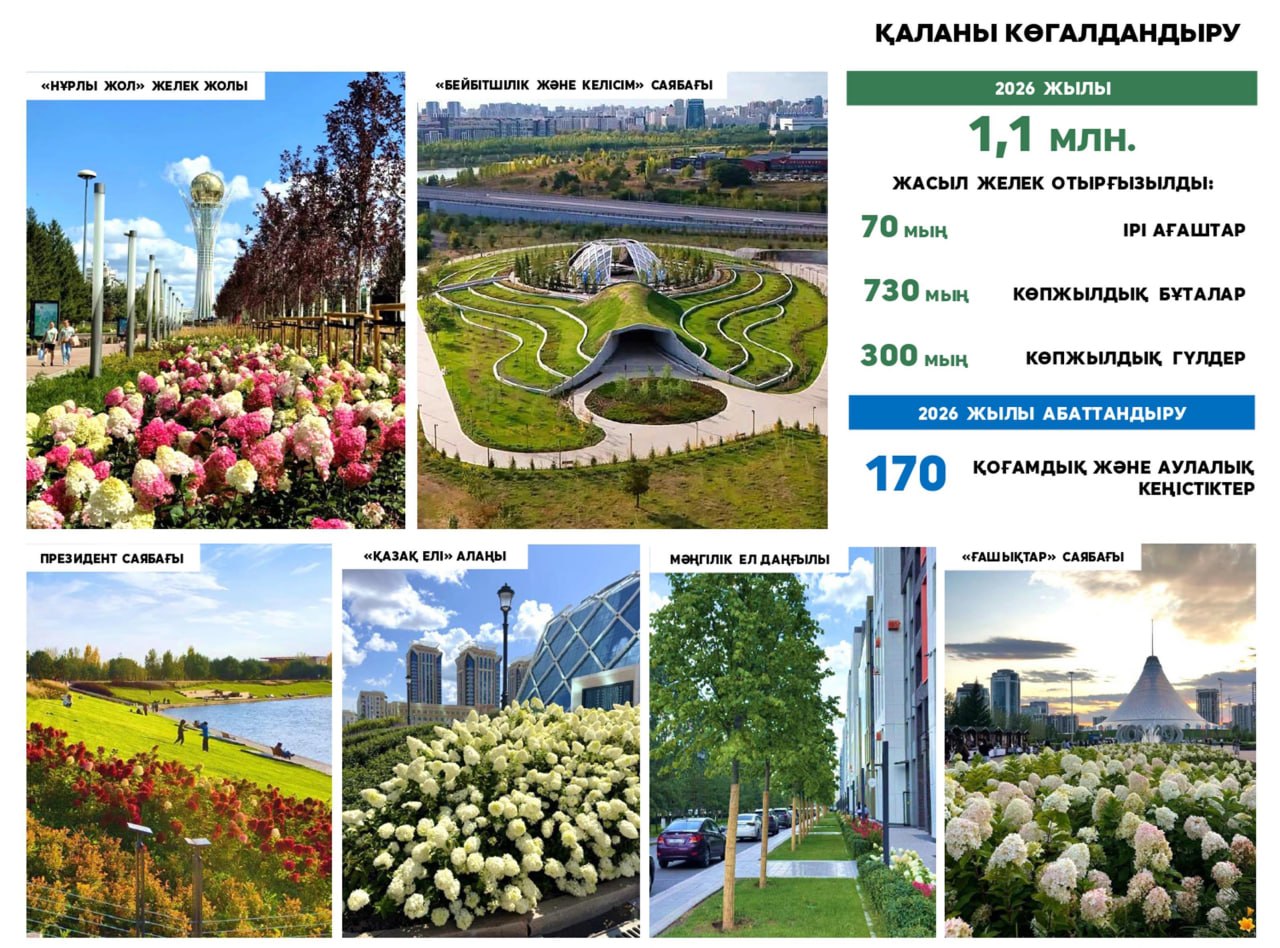 Әкімнің айтуынша, биыл Астанада 173 аумақты – қоғамдық кеңістіктер мен аулаларды жаңғырту жоспарланған. Сонымен қатар қалада жасыл желекті көбейту жұмыстары қарқын алады. Жыл соңына дейін 1,1 миллион түп көшет, бұта, гүл және ағаш отырғызу көзделіп отыр.