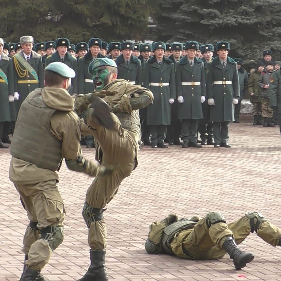 Мерекелік іс-шара барысында десанттық-шабуылдау әскерлерінің әскери қызметшілері қоян-қолтық ұрыс тәсілдерін көрсетті.