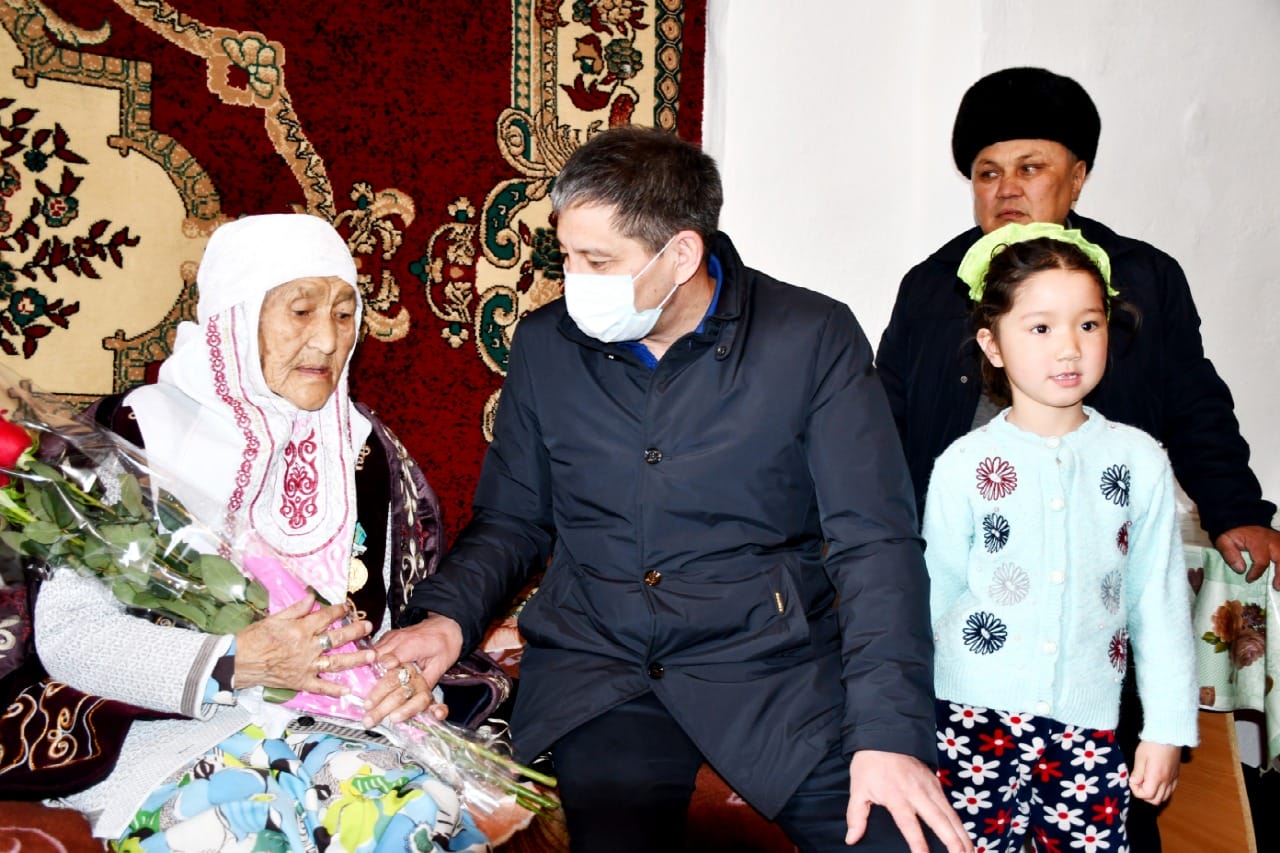 Алдымен Көктұма ауылының тұрғыны, құрсағына біткен 10 баласынан 35 немере, 26 шөбере сүйіп отырған 100 жастағы Тұрсынхан Нарымбаевамен жолықты. Бүгінде бүтіндей бір ауыл болып отырған әулеттің үлкені, бала-шағамның қамы деп қандай жұмыс болса да қаймығып көрмеген әжей: «Шырақтарым, елеп-ескеріп, құттықтауға келгендеріңіз үшін рақмет. Қарттық көңілге бұдан асқан ілтипаттың да керегі шамалы. Көрерімізді көрдік, жасарымызды жасадық. Енді перзенттеріміздің қуанышына марқайып отырмыз. Менің жасымды сіздерге де берсін», — деп, дұғалы батасын берді.